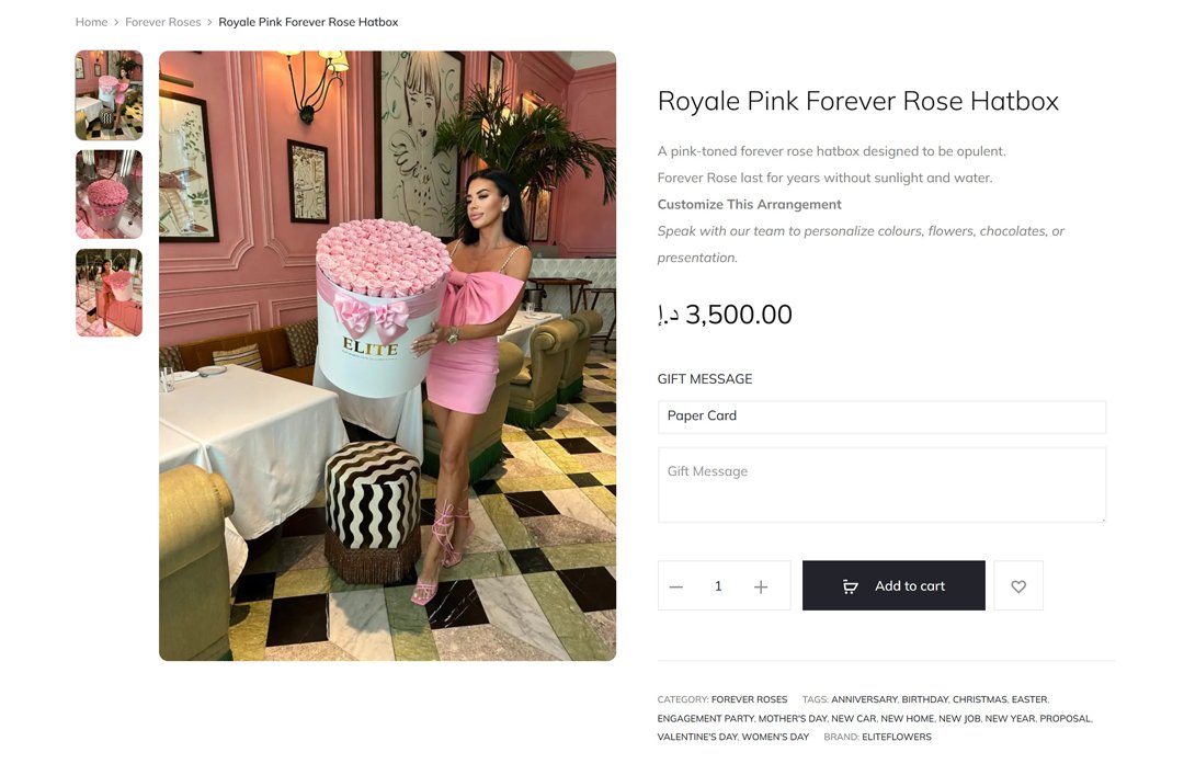Elite Flowers Dubai is a premium floral and gifting brand serving the UAE with preserved roses, fresh arrangements, artisan chocolates, curated gift boxes, and custom gifting for every occasion, from proposals and anniversaries to corporate events and national celebrations.