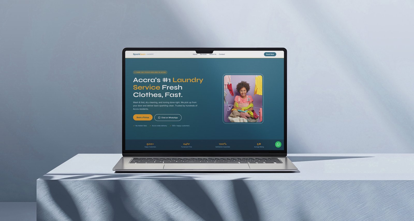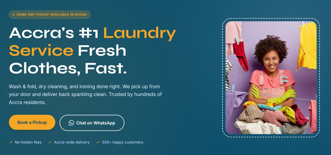Not a generic laundry template. Every decision was made around how Accra customers actually book, pay, and communicate.