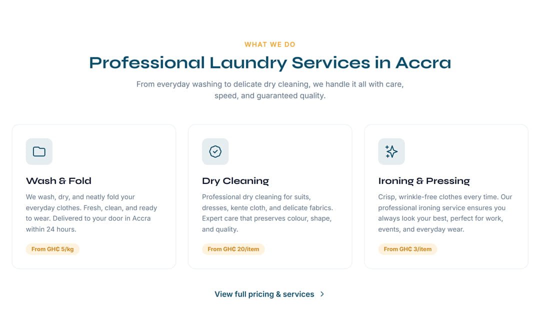 Every service block shows a starting price in Ghana Cedis: From GH₵ 5/kg, From GH₵ 20/item, From GH₵ 3/item. No 'request a quote' dead ends. Pricing anxiety is the #1 reason service bookings fail in Ghana, and we removed it from the conversation.