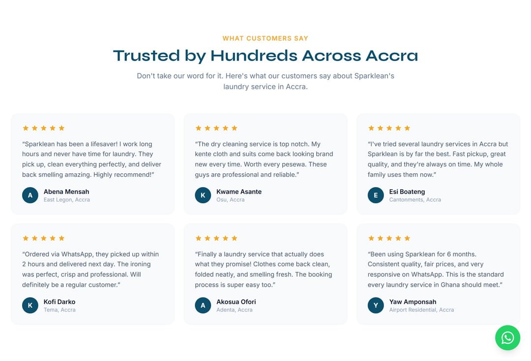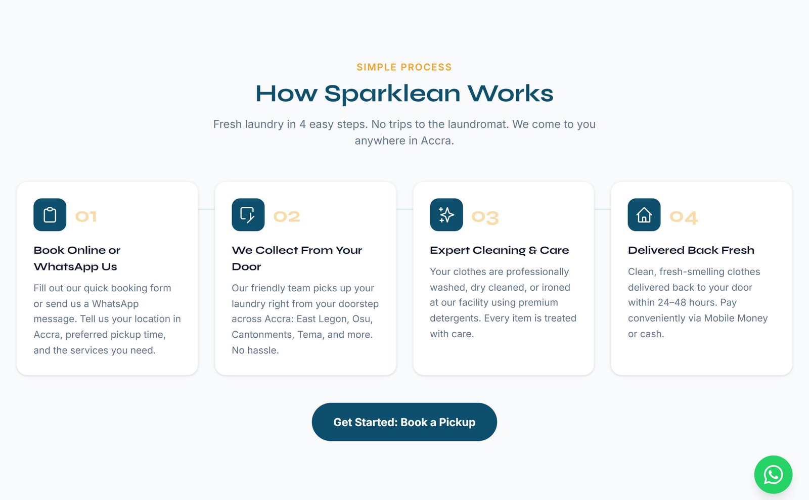 The hero leads with two CTAs side by side: Book a Pickup and Chat on WhatsApp. The WhatsApp link is pre-filled with the message "Hi Sparklean! I'd like to book a laundry pickup in Accra", so there's zero friction from intention to conversation. This single decision respects how Accra customers actually behave.