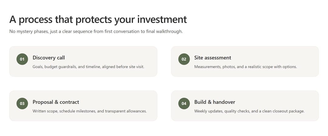 We designed a 4-step process section: Discovery Call → Site Assessment → Proposal & Contract → Build & Handover, so prospects can see exactly what working with StoneLine looks like before the first call. This removes the 'what happens next?' anxiety that kills renovation inquiries.