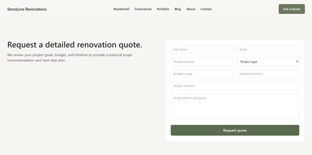 Instead of a basic contact form, we designed a structured quote request page that captures project type, scope, and budget guardrails. Every lead StoneLine receives is already pre-qualified, and the team spends time on prospects who are actually ready.