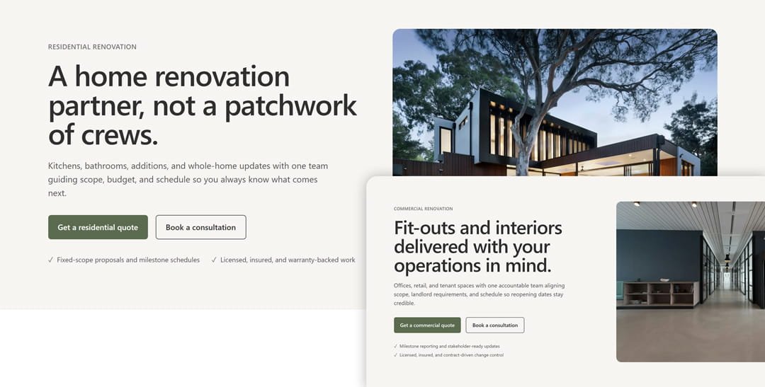 We split the site into residential and commercial tracks from the navigation down. A homeowner browsing kitchen remodels gets copy, photography, and proof points written for homeowners. A business operator planning an office fit-out gets commercial-focused content. Both audiences feel the site was built for them.