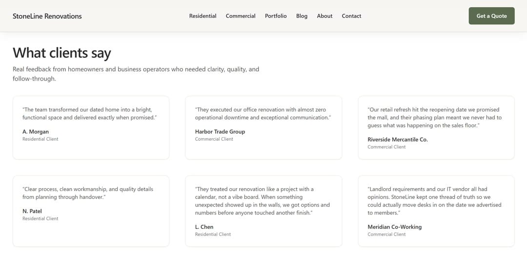 We structured the testimonial section around the actual fears renovation clients have - 'Will they hit my timeline?' 'Will they communicate?' 'Will surprises wreck the budget?' Each testimonial addresses a specific concern, not just sprinkled for decoration.